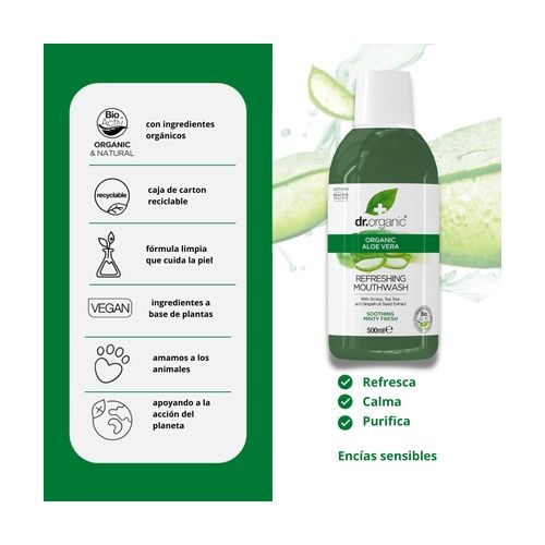 Enjuague Bucal Aloe Vera de Dr. Organic es un producto con propiedades calmantes y antisépticas.